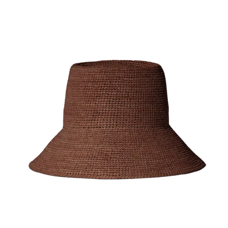 A raffia straw bucket hat made for summer. This short-brimmed crochet bucket hat was intricately crocheted to create a flexible and structured design. This effortless bucket hat can easily be worn year-round and is meant for traveling with you wherever you go whether in a suitcase, a purse or a beach bag.