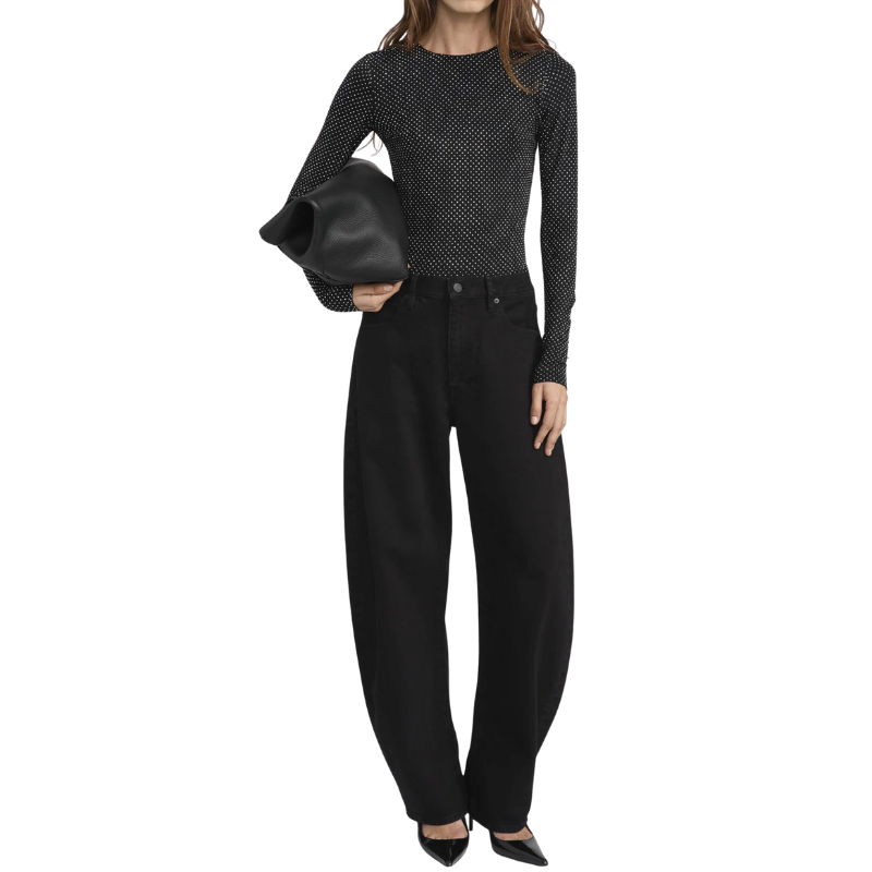 Expect compliments. This form-fitting black top features all-over micro rhinestone detailing that evokes the night sky. Crafted in an effortless jersey knit with a sleek back seam and finished with a zip closure.